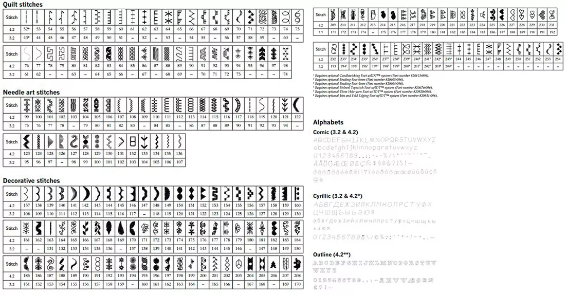 прямая, зигзаг, эластичные, потайные, оверлочные, сотовая, штопка, атласные сатиновые, декоративные, крестообразные, квилтинг, пэчворк |