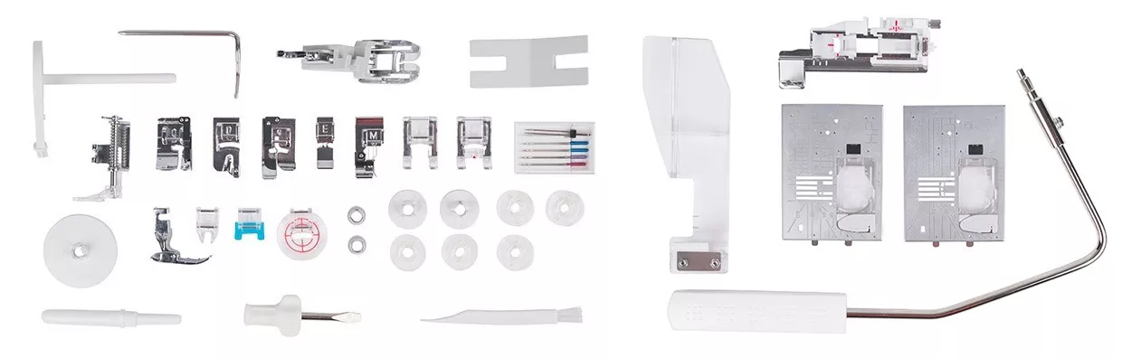 - Легко устанавливаемая шпулька и запатентованная игольная пластина с множеством направляющих линий.