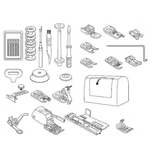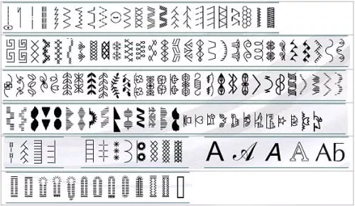 стандартная-зигзаг, для обметывания петель, для вшивания молнии, прозрачная для декоративных строчек, для квилтинга, для потайной строчки, для пришивания шнура, для пришивания пуговиц, оверлочная |