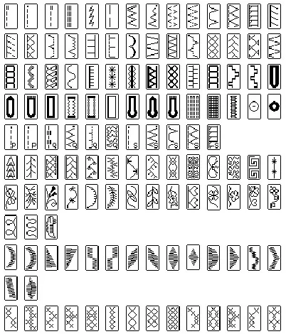 В этой модели запрограммировано 70 встроенных узоров для вышивания + 100 рисунков на CD-диске, 6 алфавитов, 120 дизайнов рамок, 10 фигур (квадраты, круги), которые можно комбинировать с 12 типами строчек.